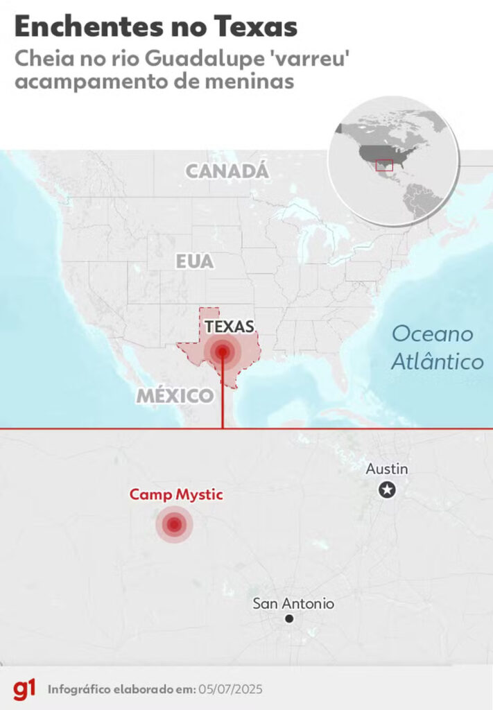 As crianças estavam no Camp Mystic, acampamento cristão às margens do Rio Guadalupe, que foi tomado por uma forte enchente em poucas horas na sexta. Vídeos publicados nas redes sociais mostram casas e árvores sendo arrastadas pela cheia repentina.