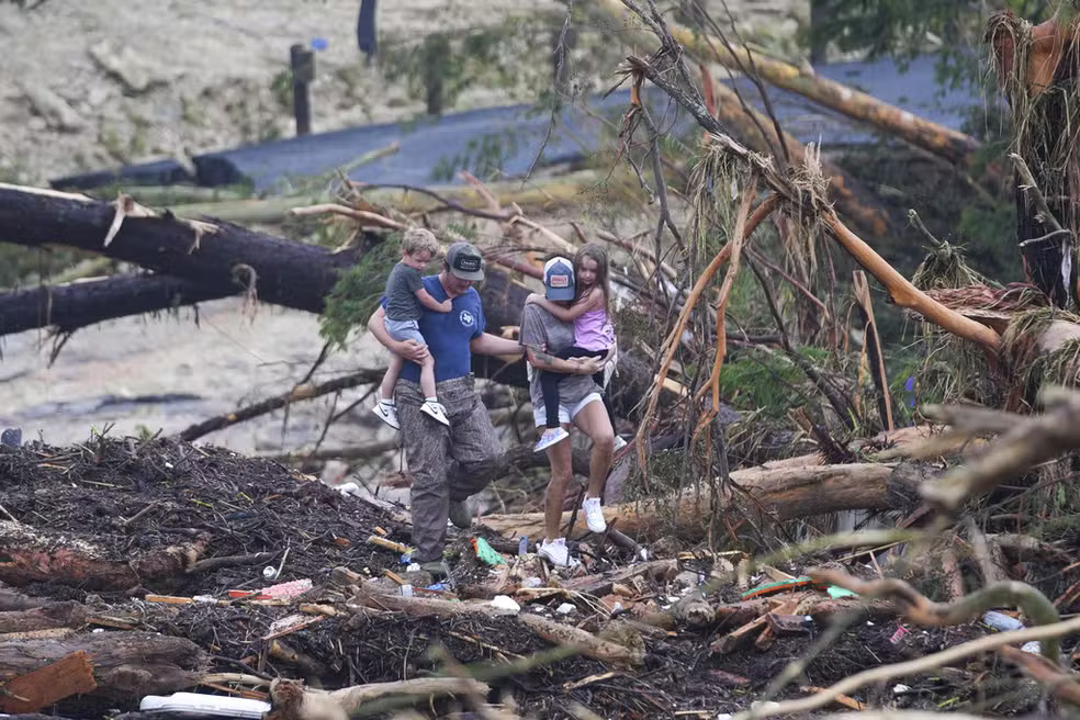 Família caminha sobre árvore caída após enchente que deixou mortos no Texas, em 5 de julho de 2025. — Foto: Julio Cortez/ AP