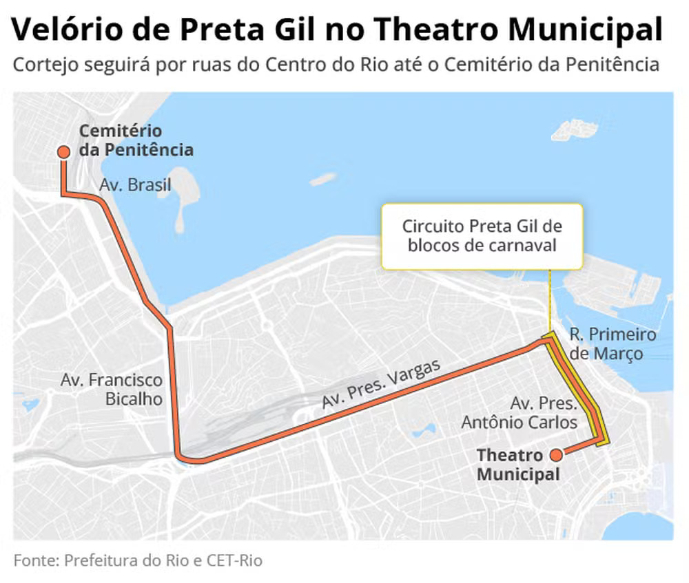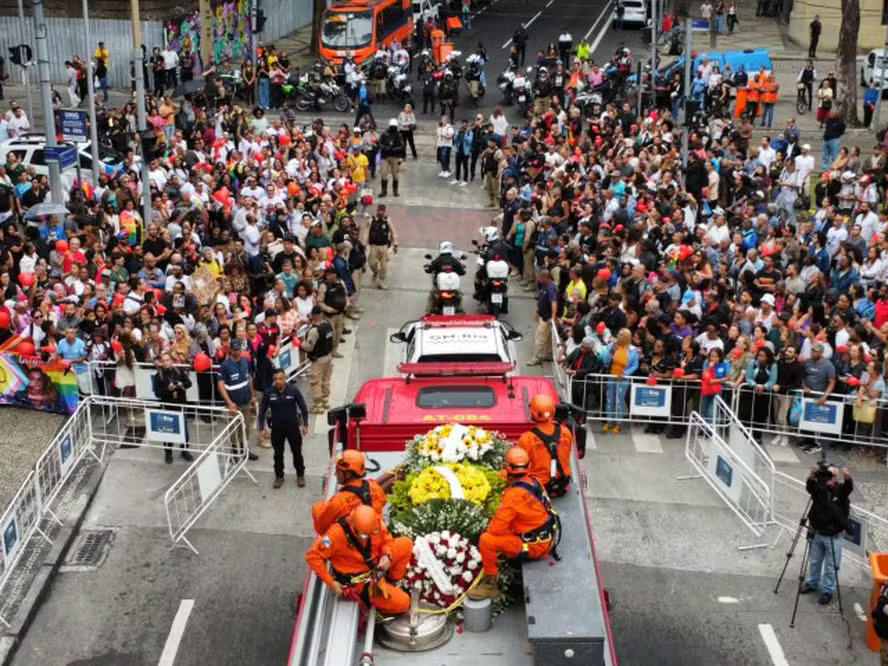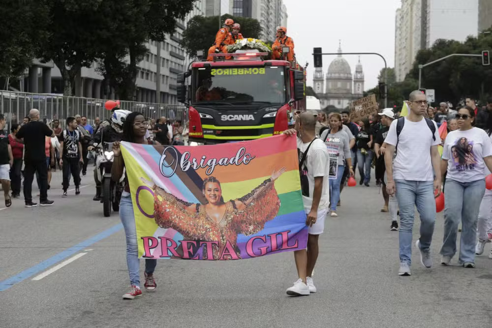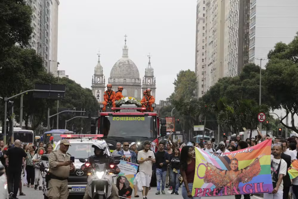 Após mais de cinco horas de velório, o corpo de Preta Gil foi levado em cortejo pelas ruas do Centro do Rio a bordo de um carro do Corpo de Bombeiros na tarde desta sexta-feira, 25 de julho. O caixão foi levado pelas escadas do Theatro Municipal por volta das 15h, sob o som de um surdo da Mangueira, aplausos e gritos de “Preta, eu te amo” de centenas de fãs que aguardavam na frente do histórico edifício. Admiradores carregam balões de ar vermelhos em forma de coração, numa demonstração de carinho à artista, que morreu no último domingo em decorrência de um câncer.