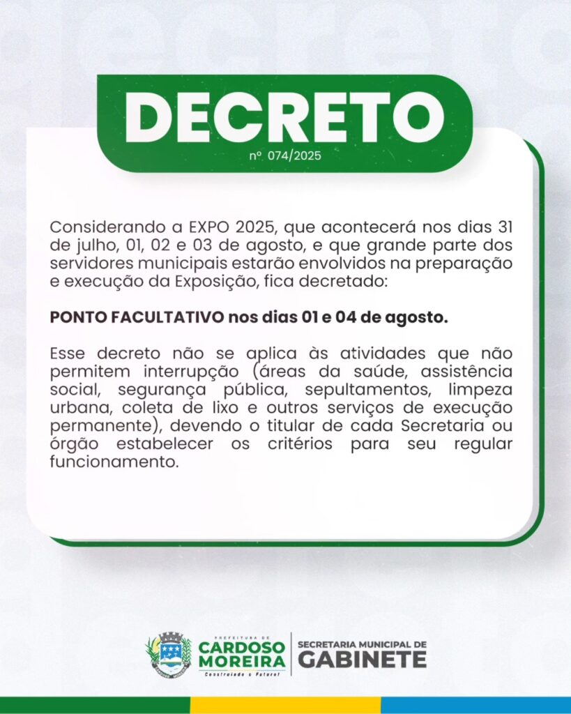 Além do Mapa do Evento foi publicado nas Redes Sociais da Prefeitura Municipal de Cardoso Moreira o Decreto Municipal informando os dias de Ponto Facultativo, durante e após as Festividades de Julho, que serão dia 1º e 4 de agosto. Veja abaixo a arte publicada.