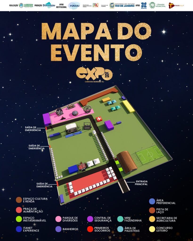 Cardoso Moreira já está a todo vapor para as comemorações da Festa de Julho, que será iniciada amanhã, 31 e encerrada no domingo, 3 de agosto. Com uma vasta programação no Parque de Exposições 31 de Julho – Tony Nascimento, e também fora do mesmo; foi divulgado na tarde desta quinta-feira, 30, o Mapa da Festa ( do Evento ), para proporcionar maior comodidade e melhor direcionamento do público durante a 31ª Exposição Agropecuária, Comercial e Industrial de Cardoso Moreira.