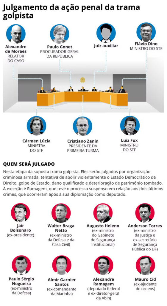 Além de Bolsonaro, serão julgados os ex-ministros Braga Netto, Augusto Heleno, Anderson Torres e Paulo Sérgio Nogueira; o ex-comandante da Marinha Almir Garnier; o deputado federal Alexandre Ramagem, ex-chefe da Agência Brasileira de Inteligência (Abin); e o tenente-coronel Mauro Cid, ex-ajudante de ordens da Presidência e delator da trama golpista.
