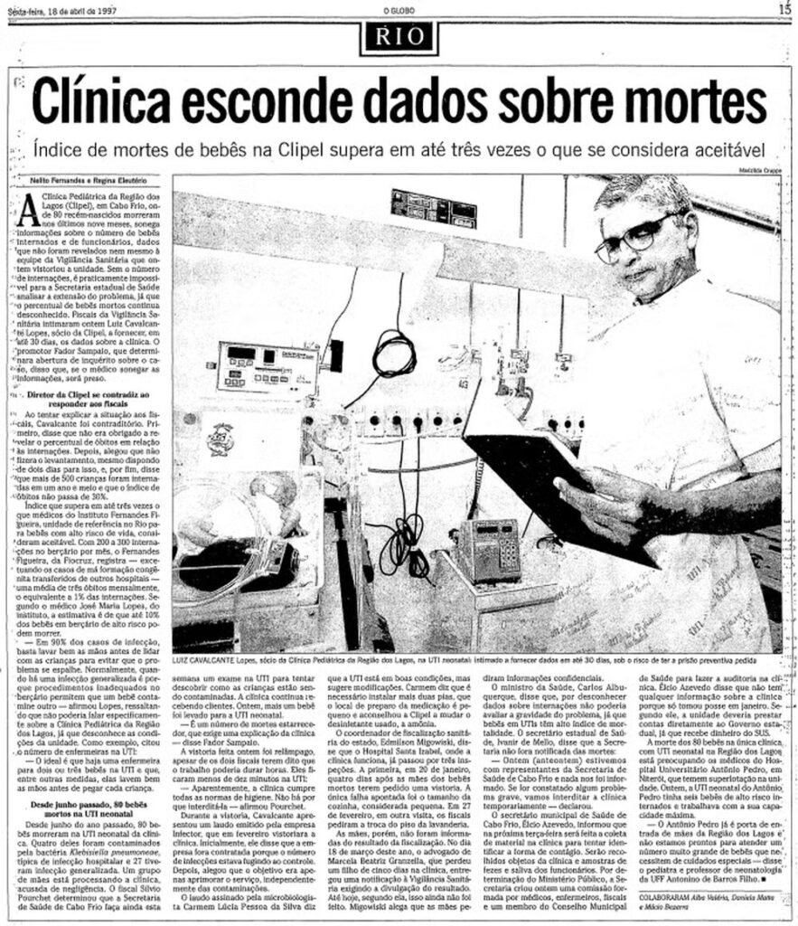 Naquele fim da década de 1990, as mortes em Cabo Frio não foram as únicas no Rio. Ainda em 1997, o então secretário estadual de Saúde, Ivanir de Mello, determinou que a Vigilância Sanitária visitasse todas as 60 UTIs neonatais do Rio de Janeiro. No fim dos anos 1990, O Globo mostrou diversas denúncias de superlotação em unidades como essas no estado, incluindo na capital. Em uma das inspeções na Clipel, inclusive, a Vigilância ordenou a retirada de cinco incubadoras que excediam a capacidade oficial da clínica.