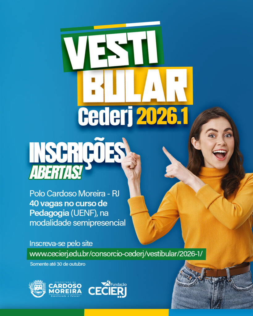 O Polo Cederj de Cardoso Moreira está com inscrições abertas para o Vestibular 2026.1, oferecendo uma grande oportunidade para quem deseja ingressar no ensino superior sem precisar sair da cidade.