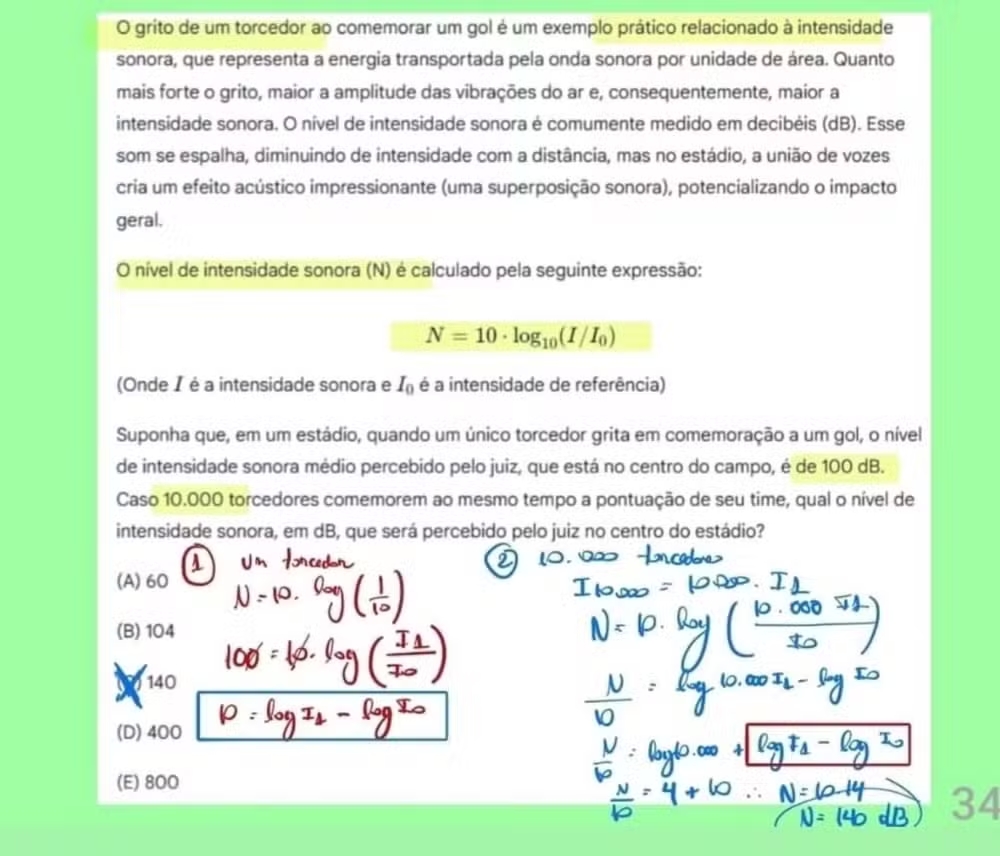 Nos stories, ele ainda listou as perguntas que utilizou com seus alunos antes da prova. Uma delas, sobre ruído sonoro, reproduz todas as alternativas idênticas, a mesma função logarítmica e também todos os valores envolvidos na questão.