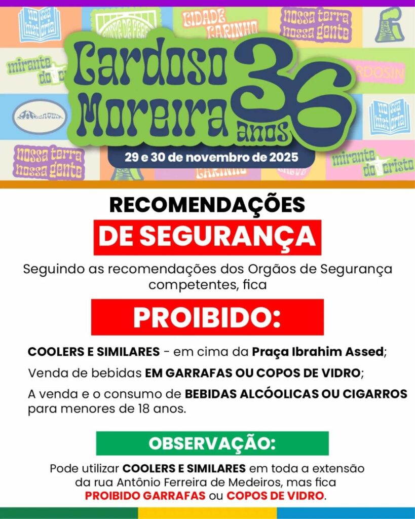 Veja abaixo as recomendações de segurança para garantir a segurança de todos que irão comemorar o último dia do aniversário de Emancipação de Cardoso Moreira:
