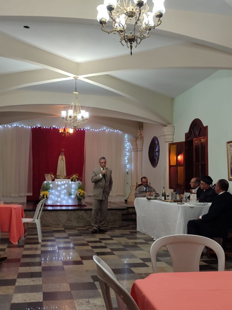 Após a Missa fiéis e convidados se reuniram no Salão de Eventos da Igreja para um jantar comemorativo do Jubileu de Bronze da ordenação sacerdotal do estimado Padre David Francisquini.
