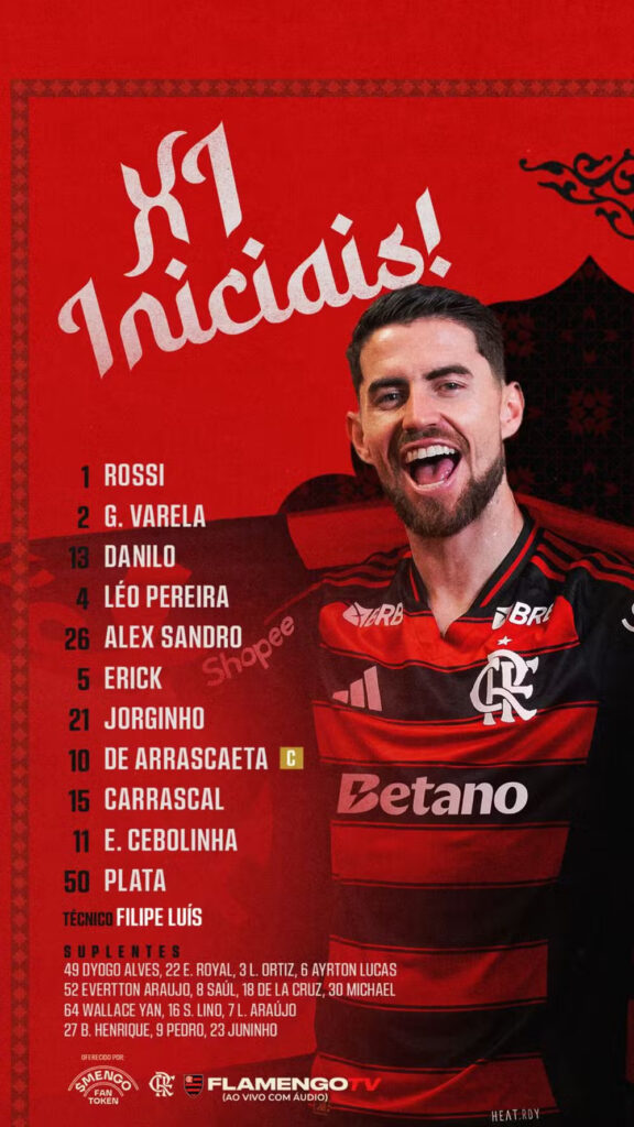 Escalação: Rossi; Varela, Danilo, Léo Pereira e Alex Sandro; Pulgar, Jorginho, Carrascal e Arrascaeta; Everton Cebolinha e Plata.
