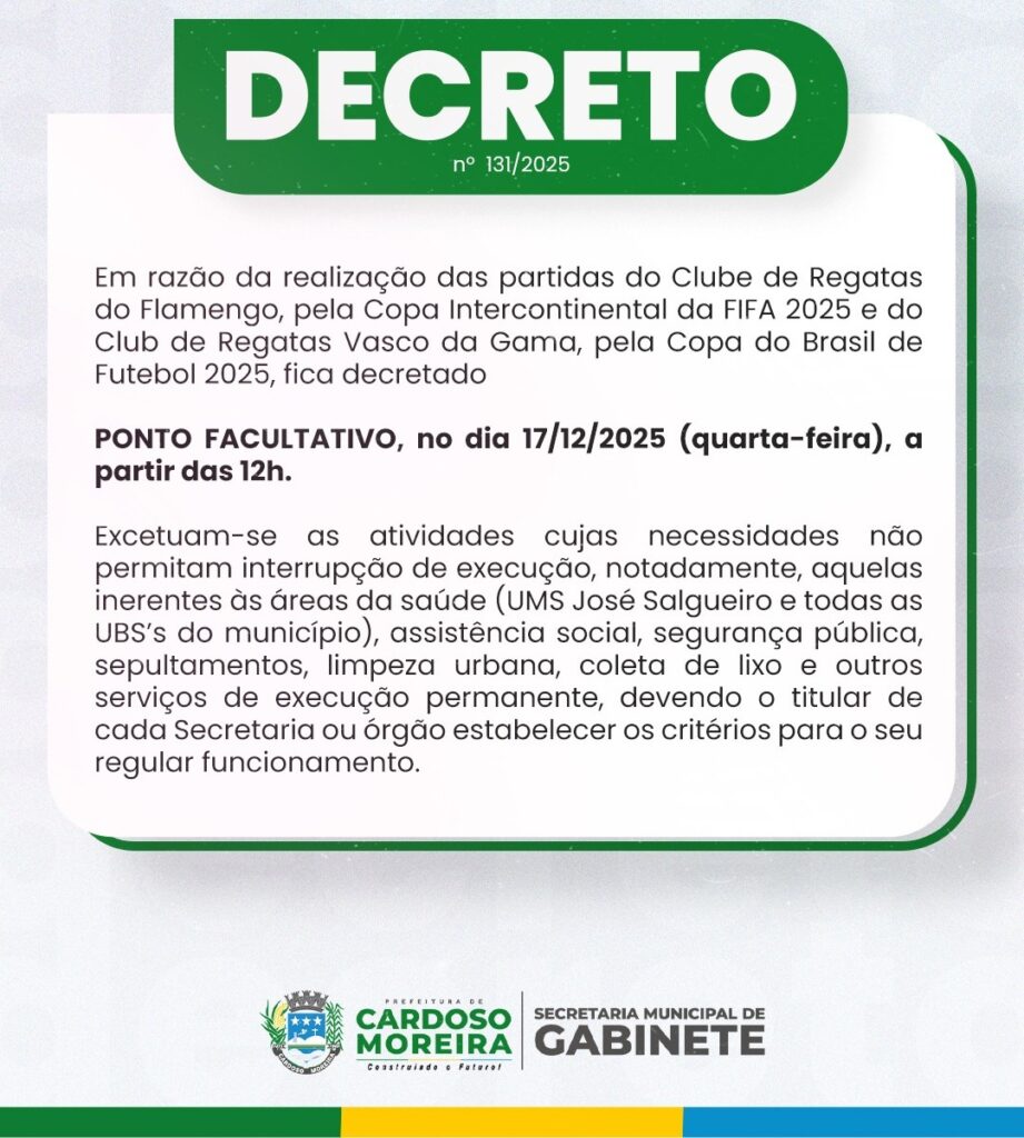 A Prefeitura de Cardoso Moreira, como o Governo Estadual e a Prefeitura do Rio de Janeiro e algumas cidades do Estado do Rio, divulgou em suas Redes Sociais o Decreto nº 131/2025, decretando Ponto Facultativo amanhã, quarta-feira, 17 de dezembro de 2025, a partir das 12h.