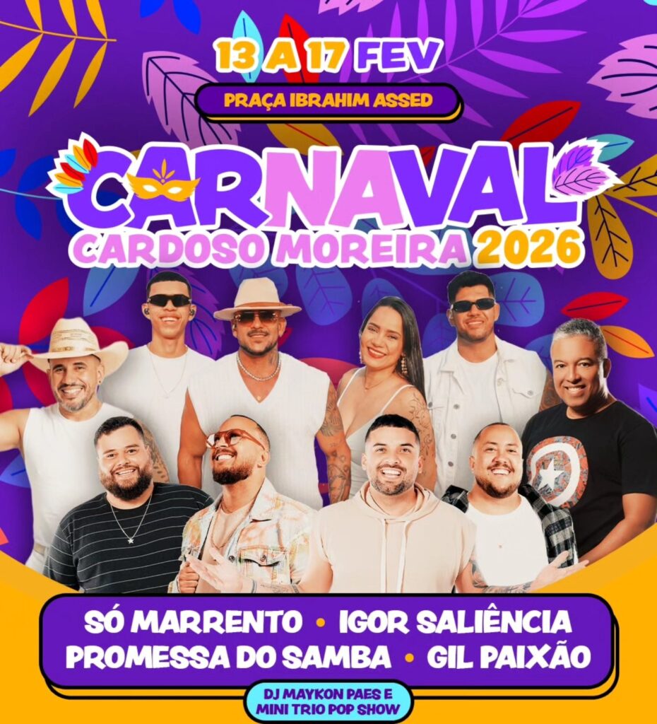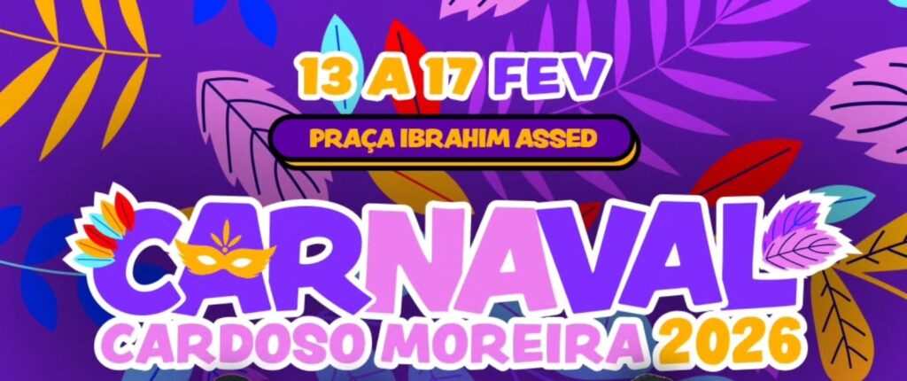 O Carnaval 2026 de Cardoso Moreira é uma realização da Prefeitura Municipal, por meio da Secretaria de Cultura e Turismo, reafirmando o compromisso com a cultura, o lazer e a valorização das tradições populares.