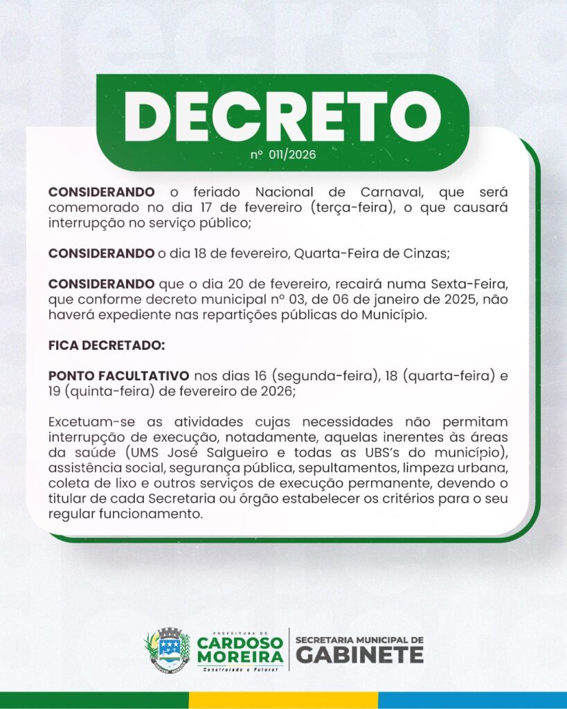 A Prefeitura Municipal de Cardoso Moreira divulgou no início da tarde desta sexta-feira, 13 de fevereiro, o Decreto nº 011/2026 referente ao Carnaval 2026.