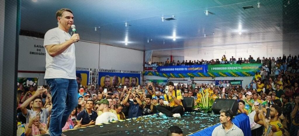 Flávio Bolsonaro (PL), foi filmado pulando e sorrindo durante o evento de lançamento da pré-candidatura do também senador Marcos Rogério (PL-RO) ao Governo de Rondônia. O ato ocorreu nesse sábado, 14 de março, no município de Ji-Paraná, no interior do Estado, enquanto o ex-presidente Jair Bolsonaro (2019–2022), pai do parlamentar, apresentou piora no quadro renal e permanece em tratamento na Unidade de Terapia Intensiva de um hospital em Brasília (DF).