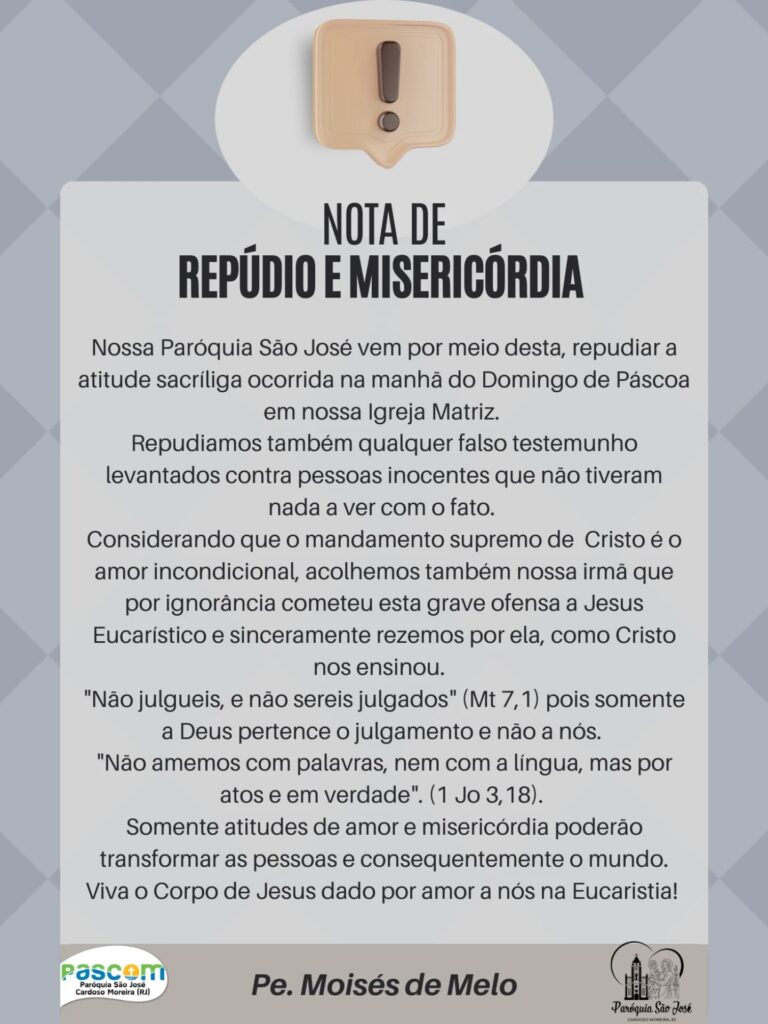 Nossa Paróquia São José vem por meio desta, repudiar a atitude sacríliga ocorrida na manhã do Domingo de Páscoa em nossa Igreja Matriz. Repudiamos também qualquer falso testemunho levantados contra pessoas inocentes que não tiveram nada a ver com o fato. Considerando que o mandamento supremo de Cristo é o amor incondicional, acolhemos também nossa irmã que por ignorância cometeu esta grave ofensa a Jesus Eucarístico e sinceramente rezemos por ela, como Cristo nos ensinou.